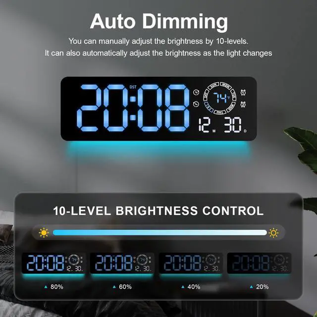 Auto Daylight Saving Time & Adjustable BrightnessEasily switch to daylight saving time with one button. Choose from 10 brightness levels manually or rely on the built-in auto-dimming sensor that adapts to ambient light for optimal viewing day and night.