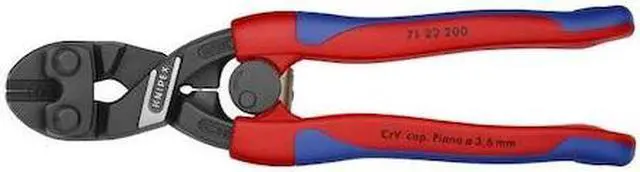 The KNIPEX 71 22 200 SBA Mini Bolt Cutter is a must-have tool for anyone who works with metal. The mini bolt cutter allows you to cut bolts quickly and easily. This multi-component grip has an ergonomic design that provides comfort while working. The beveled cutting action makes this 8 in. long mini bolt cutter ideal for light materials up to Brinnell 455/Rockwell C48 1/8 in. It also has hard materials up to Brinnell 300/Rockwell C31 1/4 in., making it suitable for work on steel, sheet metal, etc. With the KNIPEX Mini Bolt Cutter, you will have the ability to make fast cuts through metal bolts or other tough objects with ease.