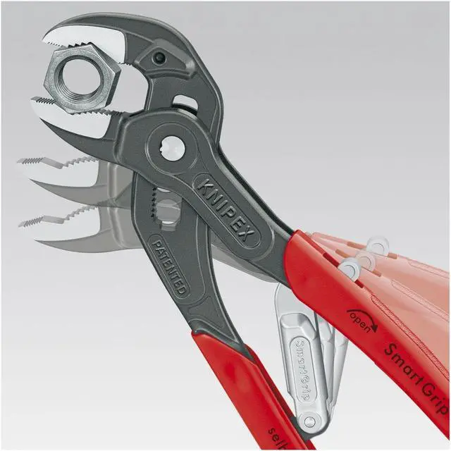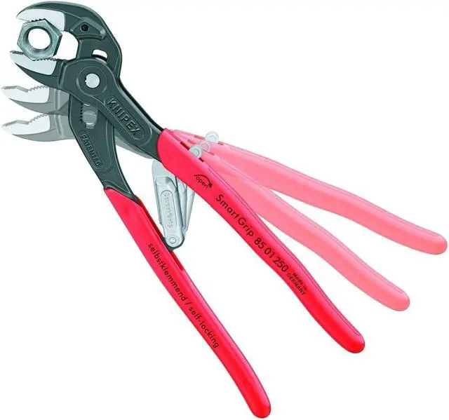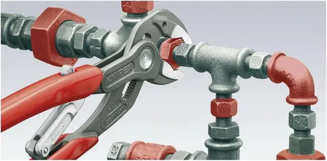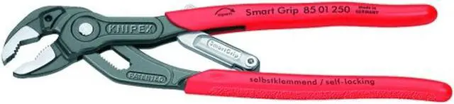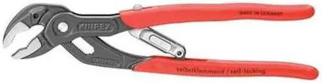 The KNIPEX 85 01 250 US 10" Self Gripping Auto Adjust Water Pump Pliers is the ideal tool for all your plumbing needs. The plier head and handles are polished, while the plier jaws are atramentized. The hand grips are made of plastic coated dipped steel. Featuring a self-adjusting jaw, this V-jaw water pump plier will grip fasteners tightly in place. It has a 1 3/16" jaw width and 10" overall length. If you need to make sure that your work is done right, you should definitely equip yourself with the KNIPEX 85 01 250 US 10" Self Gripping Auto Adjust Water Pump Pliers.