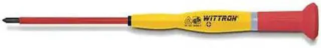 This KNIPEX 9T 89942 Insulated Precision Screwdriver is a must-have for electricians and anyone who works with electrical components. It is perfect for working in tight spaces. With an ergonomic handle design, this screwdriver has a rotating cap and color coded ring that allows you to easily identify the size of the tip you are using. The chrome finish offers a bright look, while the black tip adds contrast. Made from alloy steel, its shank is 1 3/4 in long and 4 1/4 in overall length. This Phillips #00 screwdriver has a round shank material that allows it to fit into small spaces more easily than standard screwdrivers.