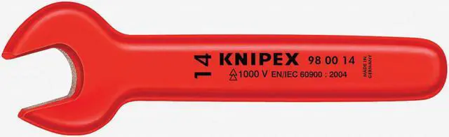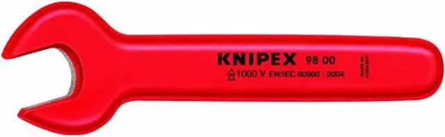 This KNIPEX 10mm Open-End Wrench is a reliable tool for your next project. The open end wrench has been rated to 1000VAC, and meets insulation standards IEC 60900 DIN EN 60900. It features alloy steel construction, and chrome vanadium steel material for increased durability. With an overall length of 4 1/8 in., this open end wrench has a 1 1/16" width and 25/64" head size. You can use it on a variety of fasteners with its 10 mm head size. This KNIPEX 10mm Open End Wrench is the perfect addition to your tool kit.
