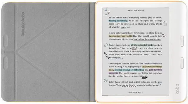 Made with recycled materials, the Kobo Libra Colour SleepCover is the best way to take your eReader with you wherever you go, personalize it, and keep it looking great. It's also made to move with you: the built-in stand lets your eReader stand on its own in portrait or landscape mode. Kobo Libra Colour wakes automatically when you open the cover and sleeps when you close it. Available in Dusk Blue, Butter Yellow, and Black. Please note Kobo Libra Colour SleepCover is only compatible with Kobo Libra Colour.
