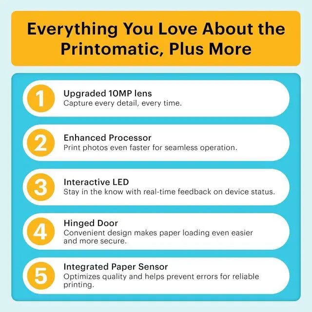 The Printomatic+ is the ultimate Kodak instant camera thats packed with everything you need and more! Combining convenience, creativity, and fun, this portable, easy-to-use instant print camera lets you capture every moment on the spotwhether youre at a party, on vacation, or just enjoying everyday adventures. The 10MP sensor of the instant picture camera ensures sharp, vibrant photos, while the lightning-fast print time means youll never miss a moment. Featuring a built-in battery, the instant digital camera its always ready for your next adventure, and the interactive LED status indicator keeps you informed when your portable camera is charged, processing, printing, or cooling down. With the camera instant print, simply point, shoot, and print, and watch your memories come to life on durable, smudge-proof, and tear-resistant sticky-backed photo paperno ink or toner needed. From special events to spontaneous fun, the Kodak instant film camera transforms fleeting moments into long-lasting memories, making it the perfect companion for capturing lifes best moments in vibrant color!