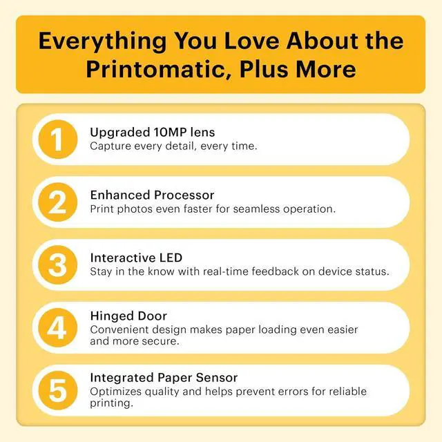 The Printomatic+ is the ultimate Kodak instant camera thats packed with everything you need and more! Combining convenience, creativity, and fun, this portable, easy-to-use instant print camera lets you capture every moment on the spotwhether youre at a party, on vacation, or just enjoying everyday adventures. The 10MP sensor of the instant picture camera ensures sharp, vibrant photos, while the lightning-fast print time means youll never miss a moment. Featuring a built-in battery, the instant digital camera its always ready for your next adventure, and the interactive LED status indicator keeps you informed when your portable camera is charged, processing, printing, or cooling down. With the camera instant print, simply point, shoot, and print, and watch your memories come to life on durable, smudge-proof, and tear-resistant sticky-backed photo paperno ink or toner needed. From special events to spontaneous fun, the Kodak instant film camera transforms fleeting moments into long-lasting memories, making it the perfect companion for capturing lifes best moments in vibrant color!