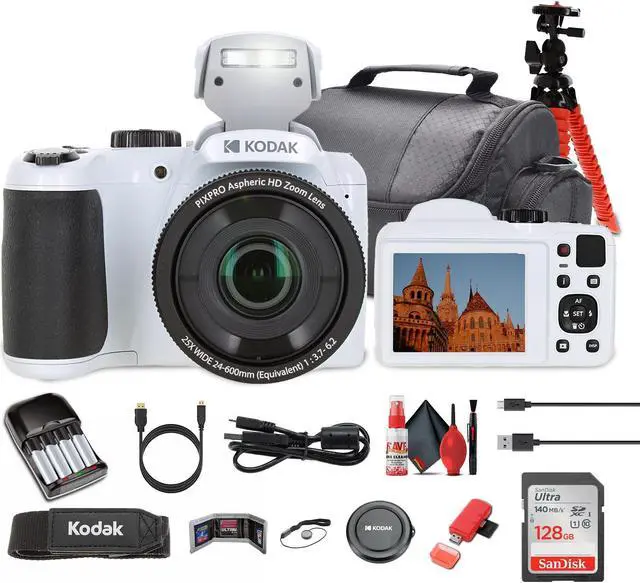 The Kodak PIXPRO AZ255 is a versatile, compact camera tailored for photography enthusiasts seeking a wide range of capabilities. At its core, the 16MP 1/ 2.3" BSI CMOS sensor ensures high-resolution stills and smooth Full HD 1080p video recording at 30 fps, with an ISO range of 100-3200. The back-illuminated sensor design enhances performance in challenging lighting, delivering vivid colors and low-noise images. The camera's standout feature is its 25x optical zoom lens, which spans an impressive 24-600mm equivalent focal length range, catering to everything from sweeping landscapes to distant subjects.