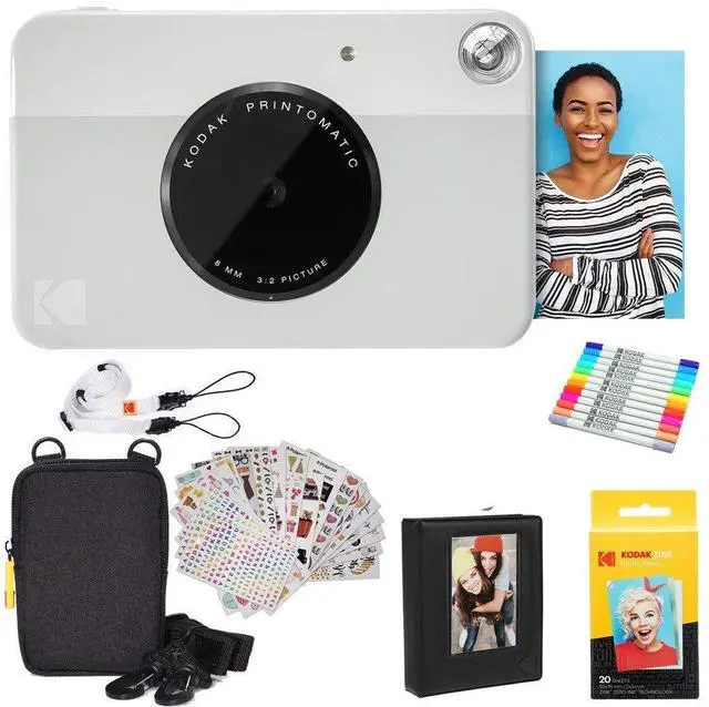 Kodak Printomatic Instant Camera (Grey) Gift Bundle + Zink Paper (20 Sheets) + Deluxe Case + 7 Fun Sticker Sets + Twin Tip Markers + Photo Album.