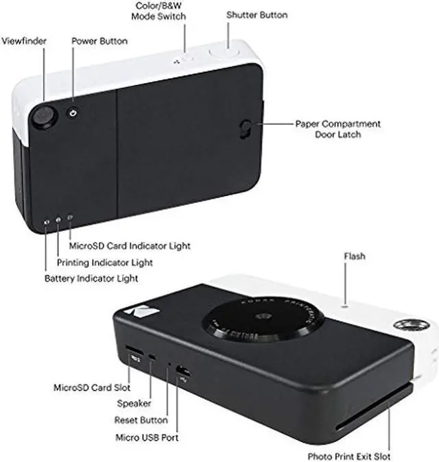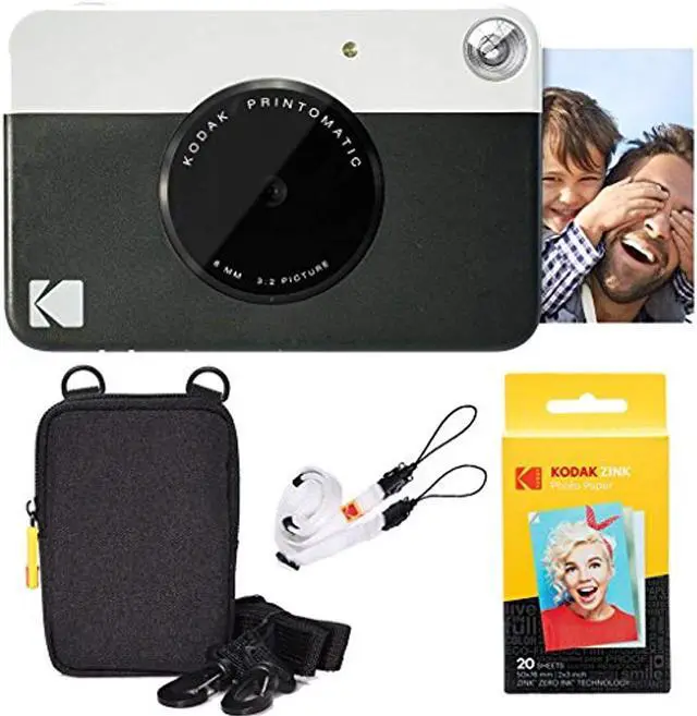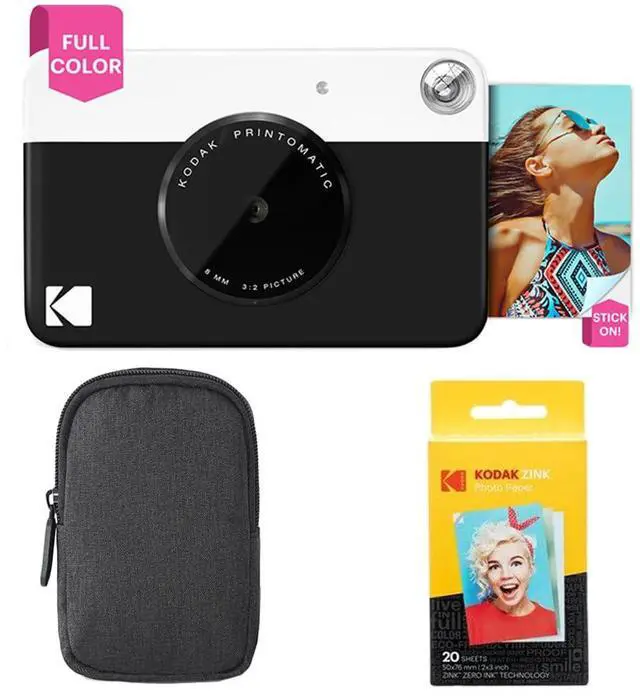Point, shoot and print with the Kodak Instant Print Camera Forget computers. Forget cumbersome printers. The Kodak Printomatic Camera prints smudge-proof, water- and tear-resistant photos up to 10 MP automatically. Just point, shoot and print. Perfect to take on the go, whenever you want to share prints, the Kodak Printomatic is the easies, funnest way to share photos with friends. Your prints are even adhesive-backed, so you can get creative and use the photos to decorate, just as you would any sticker. The camera speed even allows you to continue shooting while your photo is printing. The camera's ZERO Ink technology means you don't need to worry about messy print cartridges, film or toner. Enjoy a built-in flash and two picture modes, both color and black and white. Add a neck strap for easy handling and use the MicroSD slot for additional memory. What You Get Kodak Printomatic Camera USB Cable See Full Manual on this Page Specs & Details One (1) Kodak Printomatic Camera Built-in lithium battery Built-in Flash Two picture modes, vibrant color and black and white MicroSD card slot How to Enjoy Point, shoot and print photos automatically Prints are smudge-proof, tear-proof and adhesive-backed Choose from two picture modes for color or black and white prints Use the MicroSD card slot to expand internal memory Add a neck strap to the camera's slots for convenient carrying