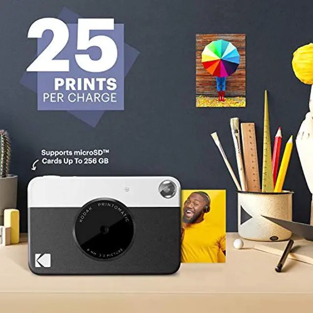 The Kodak Printomatic Insta Camera prints smudge-proof, water- and tear-resistant photos up to 5 MP automatically. With this convenient instant picture camera, you just point, shoot and print. Perfect for taking on the go, whenever you want to share prints, the Kodak Printomatic Wireless Mini Instant Camera is the easiest, funniest way to share photos with friends. This instant mini digital camera compact design slips neatly into your shirt pocket. Your prints are even adhesive-backed, so you can get creative and use the photos to decorate, just as you would any sticker.