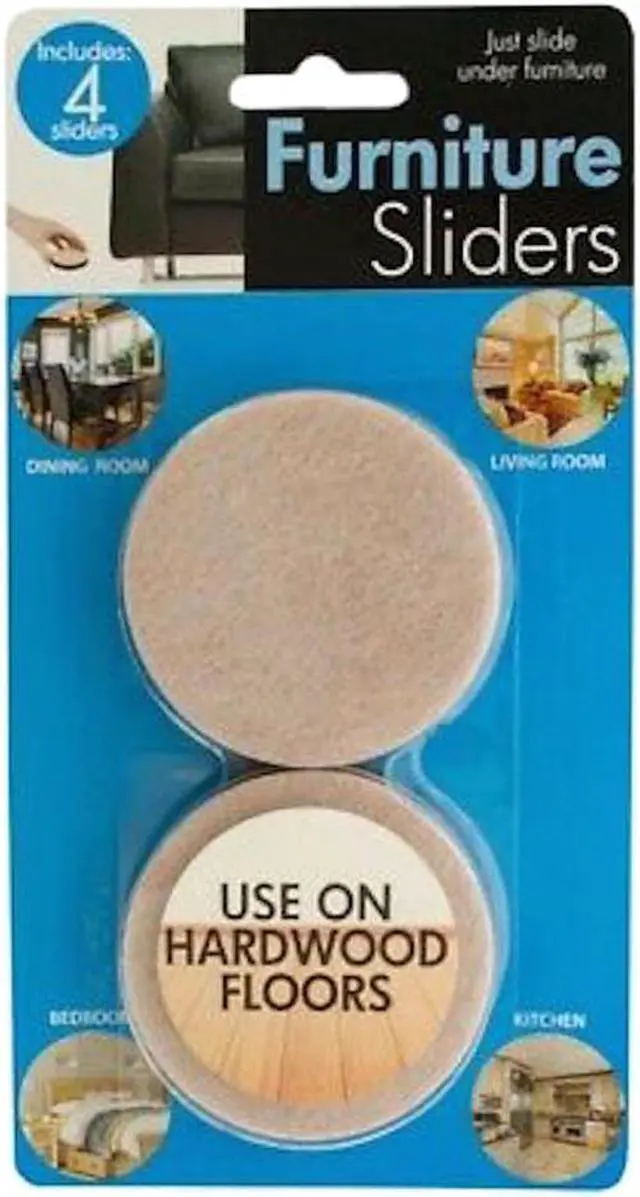 Protect floors from scratches and damage with this 4-piece Large Furniture Sliders Set featuring round layered felt and foam sliders that work on carpet and tiles and make moving heavy objects easy. Each slider measures approximately 2.5" in diameter.