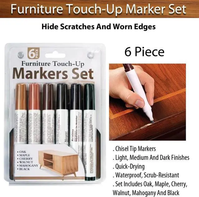 Easily conceal scratches and worn edges with this 6-piece Furniture Touch-Up Markers Set. Featuring convenient chisel tip markers, this set allows for precise touch-ups on light, medium, and dark finishes. It includes markers in oak, maple, cherry, walnut, mahogany, and black colors. Quick-drying, waterproof, and scrub-resistant, these markers are also safe and non-toxic, making them perfect for restoring your furnitures appearance with ease.
