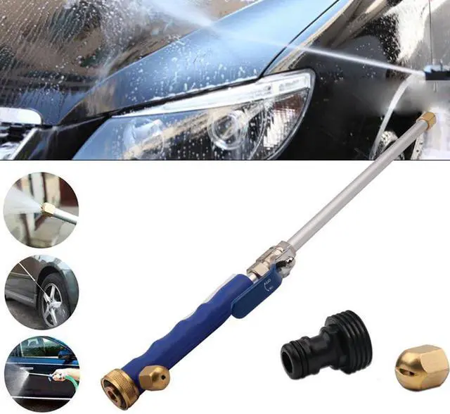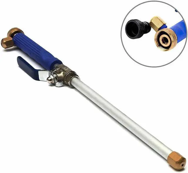 The set includes one high-pressure water gun and a plastic connection accessory designed to fit 3/4" garden hoses. Packaged within a shelf box with instructions this convenient tool measures 17.75" in length. Get ready to tackle tough cleaning tasks effortlessly with the 17.7" high-pressure water gun. The high-pressure water gun features an anti-slip handle for easy operation. The water gun includes a fan nozzle and a jet nozzle. Easy installation. Female inlet 1 in length 18 in male inlet 3/4 in product weight 0.67 lb includes fan nozzle and jet nozzle. No electricity is needed.