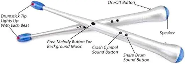 Kole - Digital Air Drumsticks. Unleash your inner percussionist with these Digital Air Drumsticks your portable beat-making companions. These innovative drumsticks feature touch-sensitive tips that not only create drum sounds but also light up in motion adding a dynamic flair to your performance. These sticks come equipped with a melody button for background music as well as crash cymbal and snare drum sound buttons making for a complete drumming experience. The built-in speakers ensure your beats are heard loud and clear. Measuring approximately 13.8" x 1.4" each these drumsticks are the perfect size for on-the-go music-making.