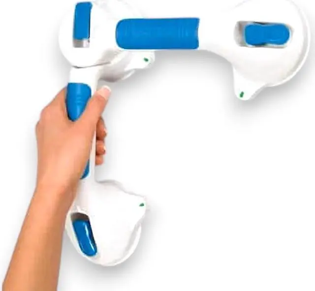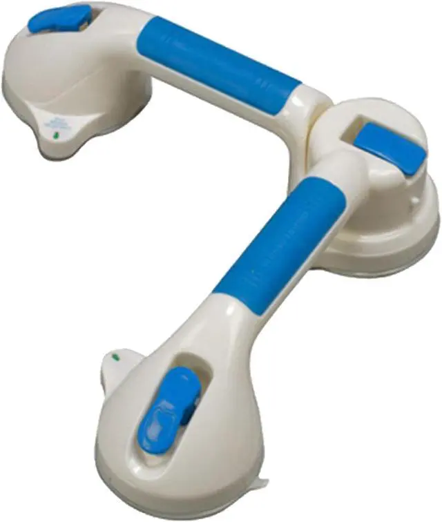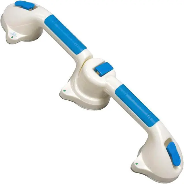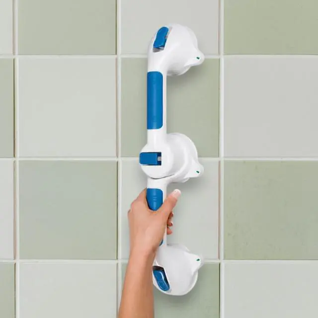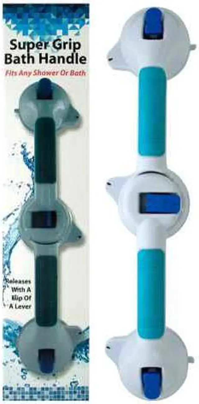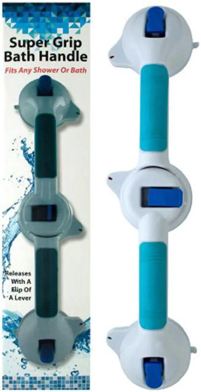 The Super Grip Bath Handle offers reliable support in the shower or bath providing a helping hand when needed. Its durable plastic handle is contoured for comfort and equipped with large suction cups that attach securely with easy-to-use push levers. Releasing the handle is simple with a flip of the lever and color-changing indicators provide clear feedback on its security. It mounts effortlessly on any nonporous surface without the need for holes screws or tools making it a versatile and convenient bathroom accessory.