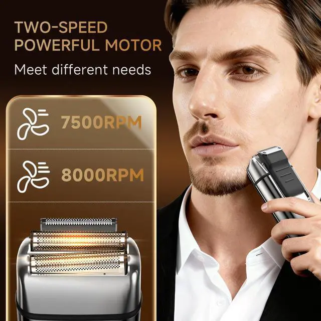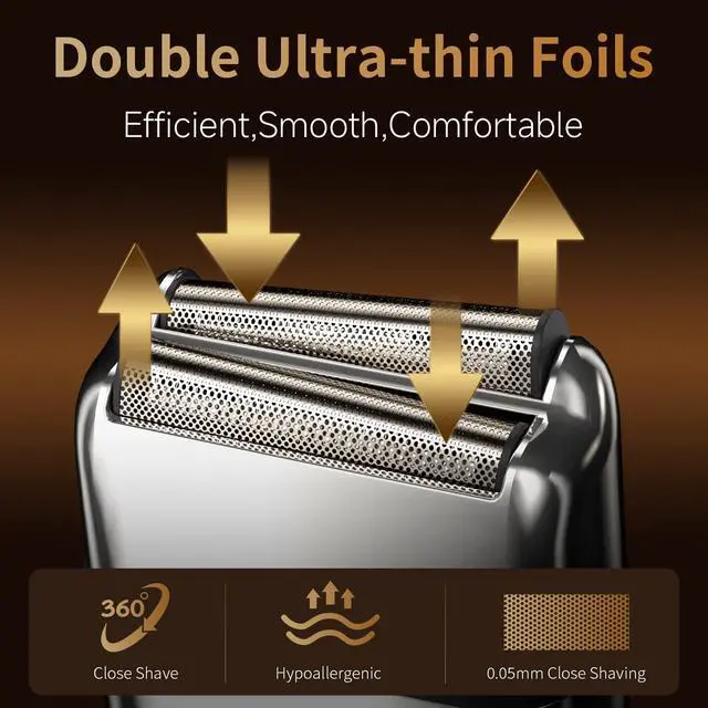 Smooth Close Shave Electric Foil Shavers for Men: Mens electric razor is designed with ultra thin but durable double-foil meshes and advanced 4D flexible stainless steel dual-blade plated with protective coating, so it can adapts to your facial contours for a closer, smoother, more fast and comfortable shave. No stubble is left behind. No irritation or redness especially for sensitive skin, providing a gentle and precise clean cut with this no nick, no razor burn face shaver for men.