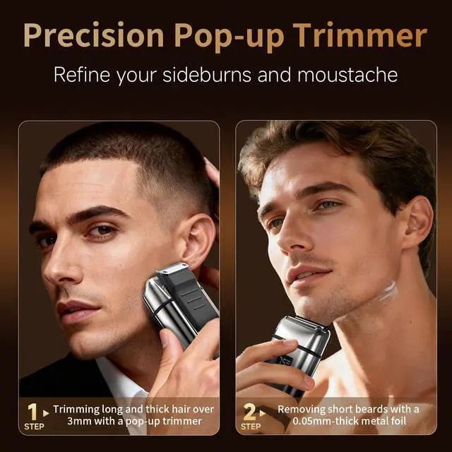 2 in 1 Mens Electric Razors for Shaving Face: Both foil shaver and the precision trimmer on the side in one device without having to remove the foil razor head. So easy to use and ergonomic design makes it easy to handhold. The push up trimmer trims down the long and short hair or heavy course thick hair on the sideburn, Jawline, chin or neck area while the sharp foil razor blade brings the shave down to the skin effortlessly.