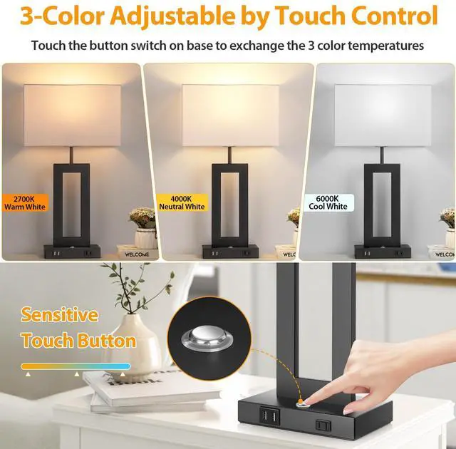 | Special Features | 3 Color Temperatures 2700K-4000K-6000K, Stepless Dimming Capacity, Dual USB Ports & 1 AC Outlet, Energy-saving&Flickering-free LED Bulbs Included, Convenient Touch Control, 22Inch Rather Tall Lamp, Pre-assembled White Fabric Lampshades, Weighted Black Metal Base & Anti-slipper Mat |