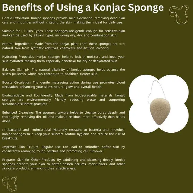 Konjac sponges are natural cleansing and exfoliating tools made from the root of the konjac plant (Amorphophallus konjac) native to Asia and have been used for over 1500 years in Japan China and Korea. Rich in vitamins proteins fatty acids and minerals these sponges provide gentle exfoliation hydration and pH balance for all skin types including sensitive skin. They can be used for daily facial and body cleansing with or without a cleanser.