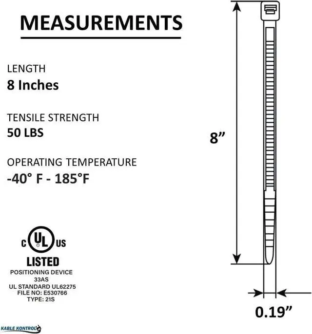 Listed: Our zip ties are UL Listed File No. E530766 Positioning Device 33AS UL Standard UL 62275 TYPE 21S ROHS compliant are Military and Federal Grade | ASTM- D4066 PA181