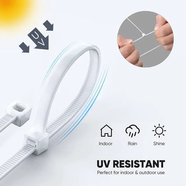 ?? Cable Ties Loop Tensile StrengthLoop tensile strength 50lbs. Cable ties tensile strength are suitable for multi-purpose projects on different occasions Increase the tensile strength by using two or more together in a row Cost-effective 100-pack of cable zipties for many uses; Comes in a re-sealable container for convenient storage.?? Upgrade MaterialsMade of industrial strength nylon 66 fire-resistant material (fire rating 94V-2). It has high toughness aging resistance corrosion resistance aging resistance UV resistance and good insulation. The excellent performance ensures their safe use even when cables or other objects are inadvertently heated.