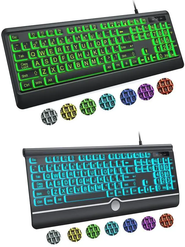 Adjustable 7 Color Backlight Lighting The wired keyboard has a colorful backlit design. You can choose your own brightness and lighting kind with its 3 brightness levels and 7 color options, depending on your preferences. You can choose from blue, green, red, cyan, purple, yellow, and white. Choosing your favorite keyboard setting and take your desk setup to the next level.