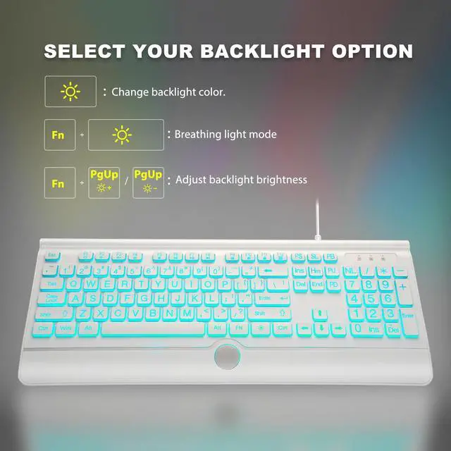 Bright and Colorful Backlit Keyboard- Rainbow backlight make the computer keyboard cool and beautiful, allow you use it in dark.There are permanent lighting and automatic breathing lighting modes for your options. You can also adjust the brightness of the backlight according to your preference.