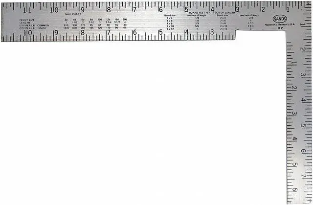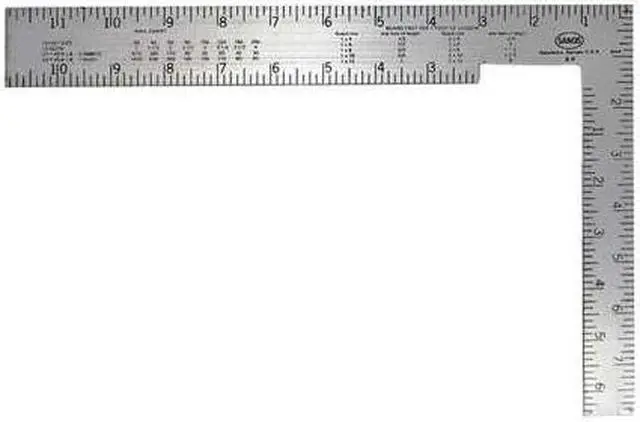 Soffit Square, Base Length 8 in, Base Width 1 in, Blade Length 12 in, Blade Width 1 1/2 in, Blade Material Steel, Graduation Mark Style Etched, Graduation Marks - Base 1/8 in, Graduation Marks - Blade 1/8 in, Specialized Scales Reverse Reading, Base Material Steel, System of Measurement SAE, Square Type Soffit Square, Coating Anti-Rust, Edge Style Square, Finish Polished, Graduation Color Black, Thickness 0.06 in, Numeric Marks Inches, Square Color Gray. This item has been restricted from sale in the following state (s): []