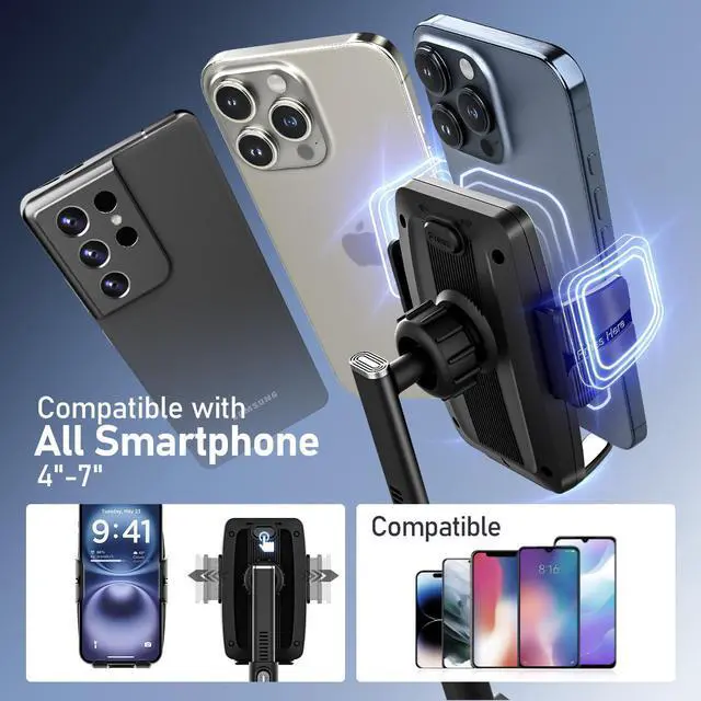 - Versatile Compatibility: A wide range of smartphones, this car phone holder fits most devices, from small phones to larger models, making it an ideal solution for trucks, car, RVs, and other vehicles.Adjustable bottom bracket can make large-sized phones stable.No more compatibility worries! Note: The thickness of your phone and phone case should not exceed 0.79 inches.