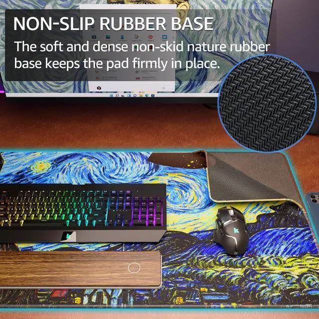 • Non-slip Rubber Base: The soft and dense non-skid nature rubber base keeps this desk pad firmly in place. This large mouse mat remains uniformly flat even over imperfect surfaces. Just immerse into your work or games without worrying about the annoying mouse pad movement.