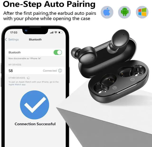 Pick up the two headsets from the charging case, and they will be paired automatically. Then simply enable bluetooth connection on your mobile phone to pair the device with your earbuds.