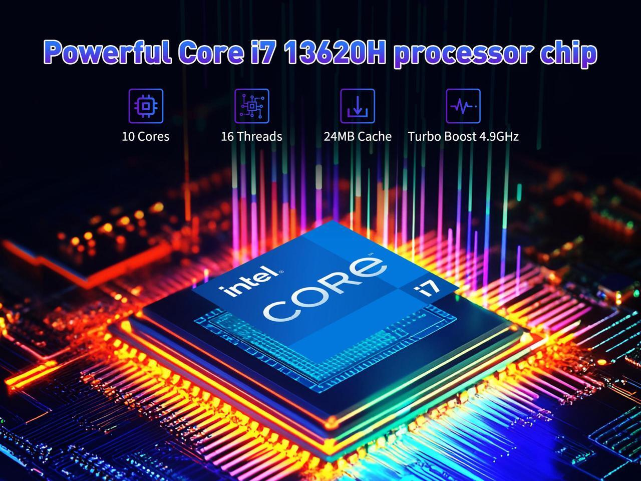 Intel Core i7-13620H processor up to 4.9GHz(10-Cores, 16-Threads); 24 MB Intel Smart Cache; 45W TDP