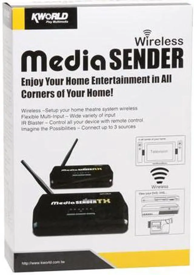 | Features | Use of 2.4GHz ISM Features Four set of transmitting channel can be selected for use, improving feasibility and reliability AV Sender supports up to 4 Channels TX/RX (4 pair of AV Senders support up to 8 devices) Matched transmitter & receiver for the same channel or one transmitter for multiple receiver of same channel Compatible with AV output equipments such as video recorder, video camera, digital camera, DVD/VCD/digital set-top box Support IR Blaster function of 433MHz infrared remote returning transmission, fully compatible with remote control as DVD/VCD/digital set-top box Strong infrared emission, without need of installing infrared emission extension cord Received image is clear and stable, bright color, articulate sound without noises Auto detecting NTSC/PAL system video and stereophonic audio transmission Complete hardware design, with no need of installing software Plug and play, easy and convenient |