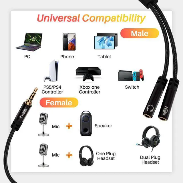 Universal Compatibility: The headphone microphone splitter supports dual plug headphones, TRS microphone and TRS speakers. It is compatible with laptop, tablet, PS5/4/3 controller, iMac, iPod, iPad, iPad 9, PC, Nintendo Switch/Switch 2, Xbox One/360, steam deck, smartphone like Samsung S10/S9/S8/A21S/A71/A70, Xperia L1, MP3/MP4 player, DVD and more device with 3.5mm jack.