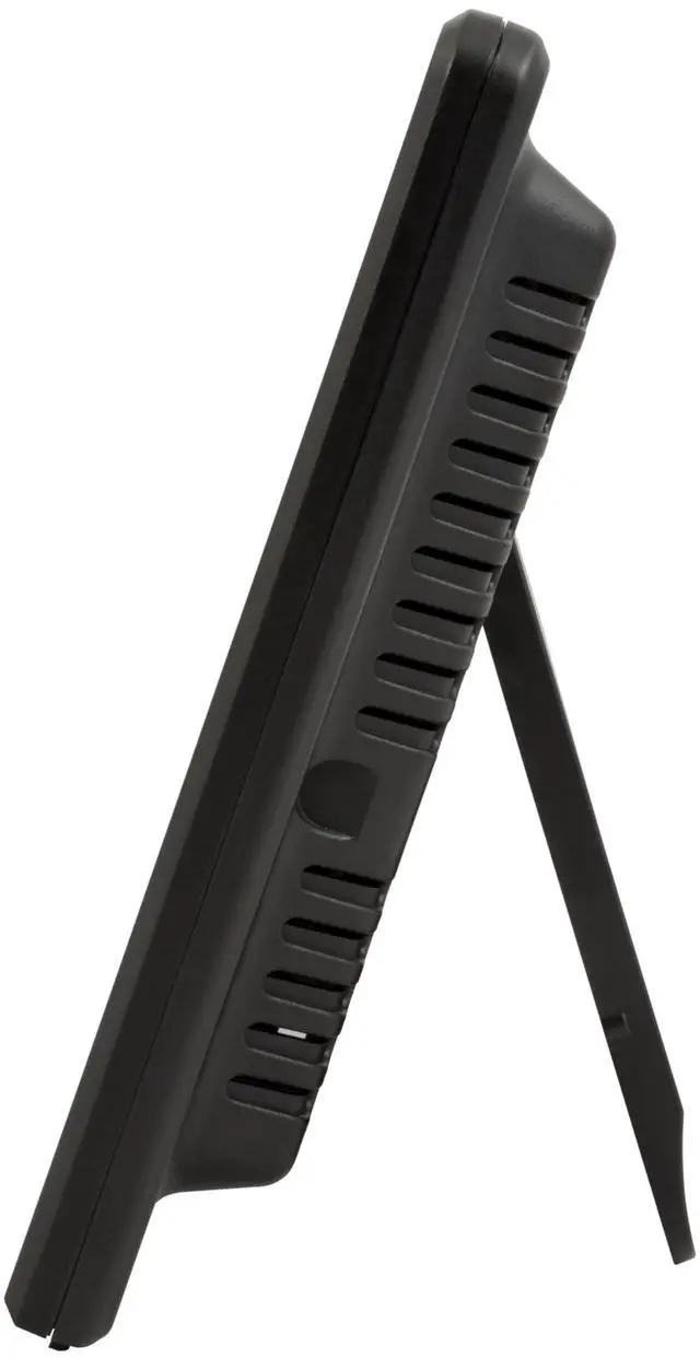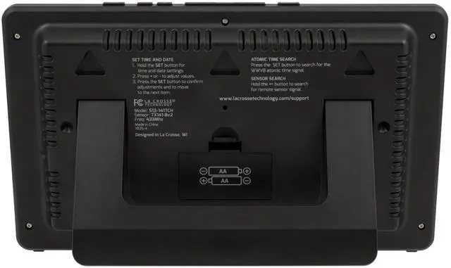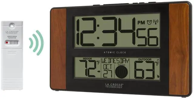 Stylish atomic digital clock is packed with many features and offers modern look to add to your living room or kitchen. Outdoor temperature display receives wireless data from weather-resistant transmitting sensor over a 330 ft (100 m) range, down to -40°F. Large, 2.125 inches tall time digits set automatically to your time zone selection and adjust to Daylight savings, all on an easy to read LCD with calendar display & moon phase. Clock indicates active alarm, WWVB signal, and low/weak battery with adjustable display language. Mount clock onto wall or fold-out leg stand to place on table.