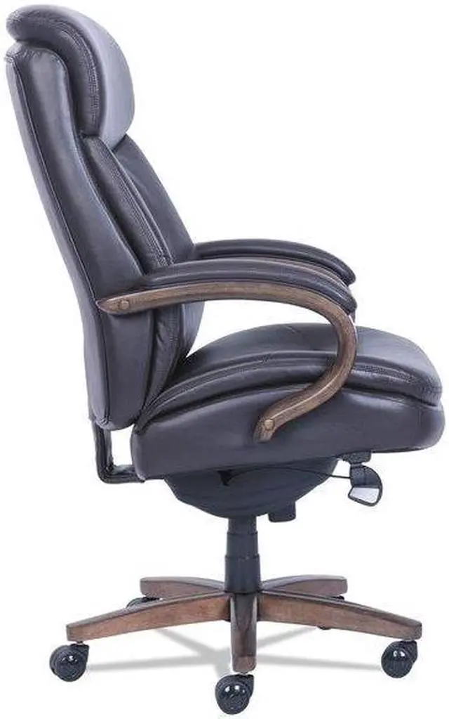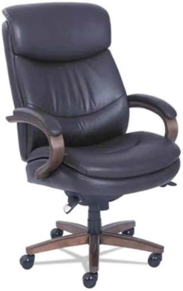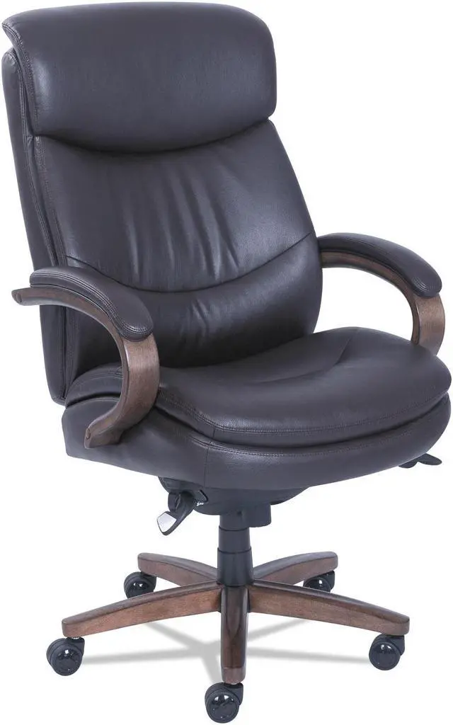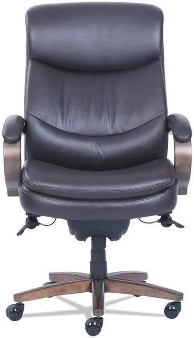 Premium La-Z-Boy® patented ComfortCore® Plus memory foam seat construction. Upholstered in commercial grade bonded leather. Wood arms and base finished with PU coating for added durability. Cable actuated seat plate for seat height adjustment and tilt function. Supports up to 400 lbs. Recommended Applications: Executive & Management; Seat/Back Color: Brown; Arms Included: Yes; Arm Style: Padded Closed Loop.