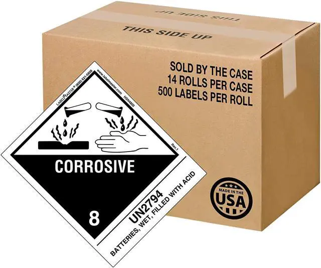 Label Stock: Semi-Gloss Paper ^^ Made in the USA ^^ Size 475" x 4" ^^ Simplify your shipping label solution with Label master's Pre-Printed Shipping Name Corrosive Labels. A two-in-one solution, combining the label ( 172.400 ) with the marking requirements of 172.300, the UN2794 Batteries, Wet, Filled With Acid label comes ready for application. In addition to complying with directives set by the DOT, these also meet the design and durability standards of 49 CFR, ICAO and other international air regulations. You'll be worry-free as these Hazard Class 8 labels are printed with light-fast inks for fade resistance and adhesives are formulated for use in various climates and environments as well as strong holds on corrugated boxes. Once affixed, they won't fade or fall off. They also feature outstanding chemical and abrasion resistance. Black and white, these paper labels are sized at 100 x 120mm (standard tab) and sold in rolls of 500.