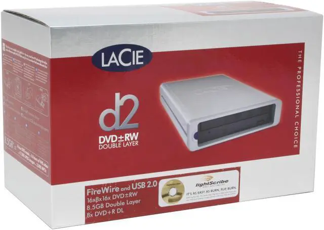 Back up valuable data, share photos, and archive MP3 libraries and MPEG-2 DVD video. With the ability to store digital data on CD or DVD media, the LaCie d2 DVD Drive allows you to burn up to 8.5GB or more than two hours of theater-quality video on large-capacity DVD general use discs.