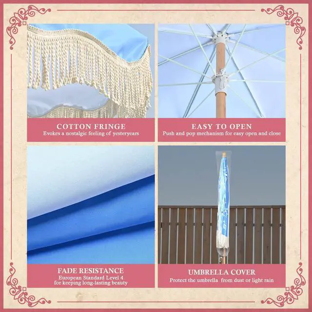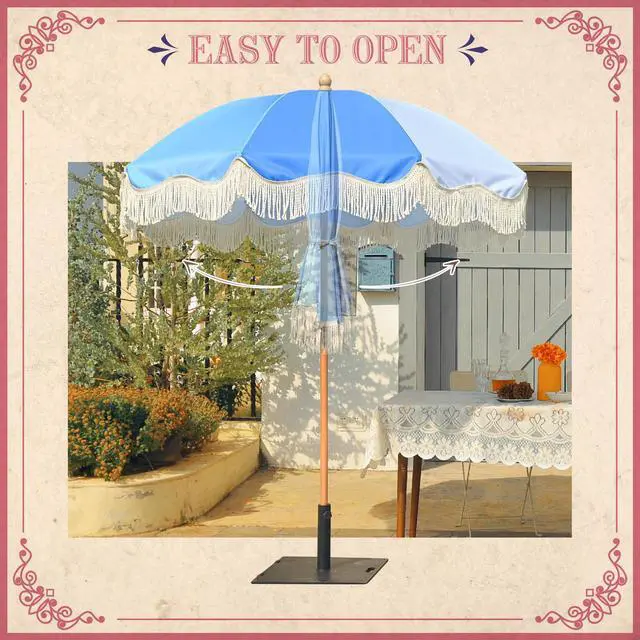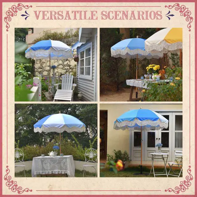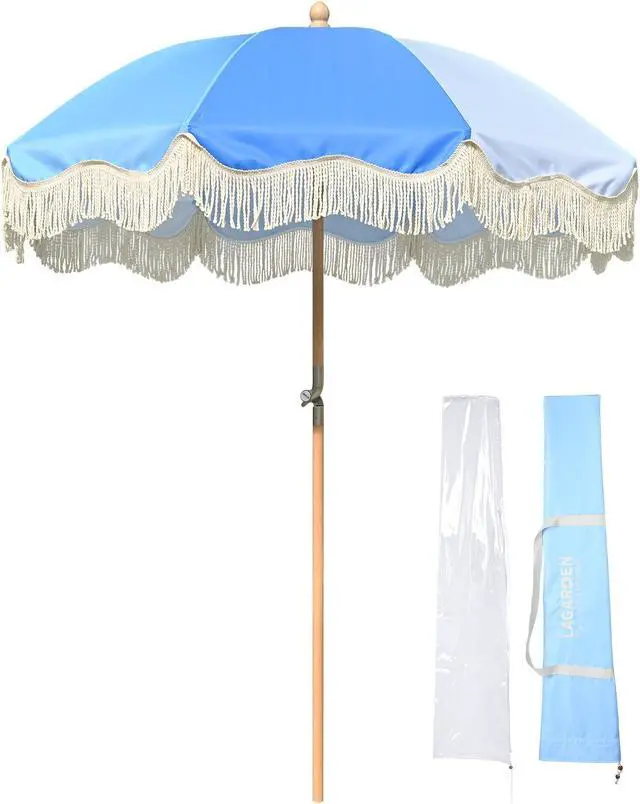 - Palm Springs Umbrella - LAGarden Palm Springs Style Umbrella with nostalgic cotton fringes adds a touch of azure sky to brighten your days, providing not only shade but also a portal to the fabulous 50's; Picture yourself lounging under the umbrella, with a Blue Lagoon in hand or hosting a delightful soiree with your loved ones.Model: PS6-03