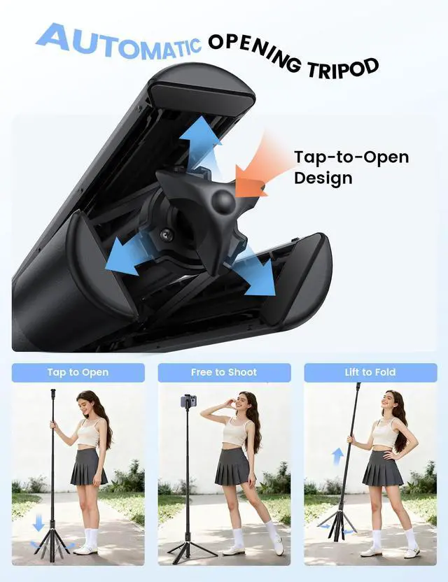 Tap-to-Open Design: The tripod for iphone introduces an upgraded tap-to-open mechanism, eliminating manual setup. A gentle toss onto the ground instantly deploys its three legs, while a quick upward pull retracts them seamlessly. This one-handed setup lets you capture the moment instantlywithout putting down your coffee or phone. Ideal for solo travelers and content creators on the go.