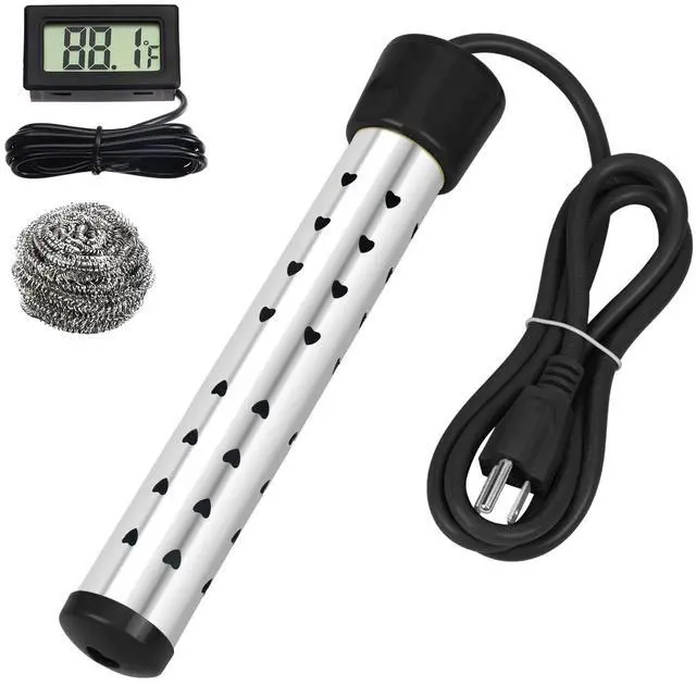 • Easy US Plug Operation & Complete Kit Fully immerse in water, plug into any 110V US outlet, and heat up fast. Comes with 1 heater, 1 LCD thermometer, 1 steel ball, 1 manual.