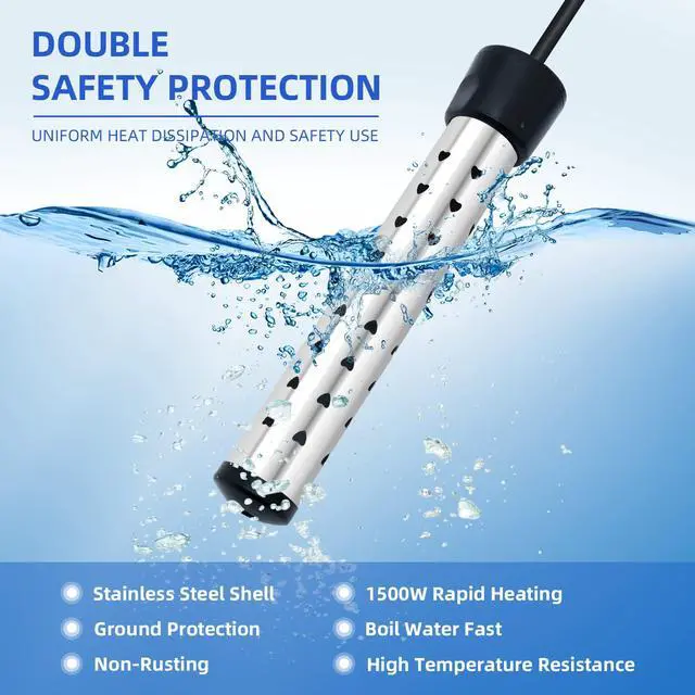 • Heat up water in minutes with our 1500W Immersion Water Heater—perfect for bathtubs, camping, or buckets. Just submerge it in water, plug into a 110V/120V outlet, and enjoy instant warmth.