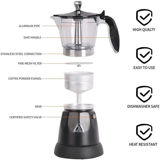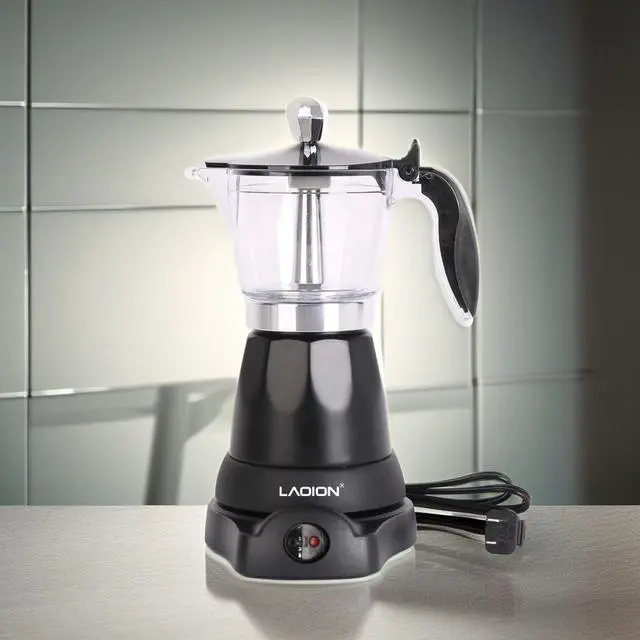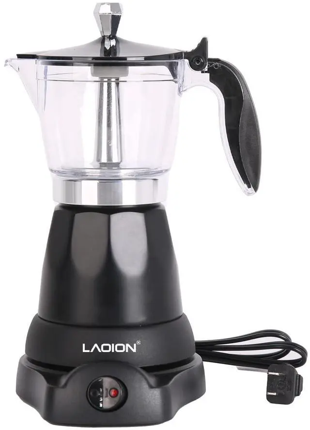 this LAOION Cafeteras Electricas Espresso Cuban Coffee Maker is the perfect addition to your kitchen if you are a coffee lover. With its sleek design and advanced features, this electric coffee maker will let you enjoy delicious, rich and flavorful Italian coffee, Cuban coffee or any espresso-based drink in the comfort of your own home. This coffee maker is specifically designed for making authentic Cuban coffee. It can brew up to 6 cups of espresso (50ml per cup) at a time, making it ideal for entertaining guests or preparing multiple servings. The electric moka pot is equipped with a heating element that provides consistent and optimal brewing temperature, ensuring that each cup of coffee is brewed to perfection. One of the standout features of this cafetera eléctrica is its easy-to-use operation. Simply add water to the designated water reservoir, fill the coffee filter with your favorite ground coffee, and then just press the power button. The coffee maker does all the work for you, including brewing, heating, and maintaining the right pressure throughout the brewing process. The electric moka pot is made from high-quality materials that are built to last. The durable build ensures that this Cuban coffee maker will withstand daily use and provide reliable performance for years to come. The sleek and compact design makes it easy to fit into any kitchen space, be it a countertop, shelf, or cabinet. Not only does this electric espresso coffee maker produce delicious coffee, but it is also extremely easy to clean. The detachable parts are dishwasher safe, making cleanup a breeze. No more spending time scrubbing pots and filters. Simply remove the parts, give them a quick rinse, and you're done. This electric moka pot is also perfect for those who are always on-the-go. With its convenient features, you can brew your coffee quickly and efficiently. You don't have to wait for the coffee to brew or stand by the stove to ensure perfect brewing. Simply set it up, press the button, and in a matter of minutes, you will have a flavorful cup of coffee to start your day. Whether you are a coffee connoisseur or a casual coffee drinker, this LAOION Cafeteras Electricas Espresso Cuban Coffee Maker is a must-have appliance in your kitchen. Experience the rich and authentic taste of Italian espresso or Cuban coffee with just the touch of a button. Get your electric coffee maker today and elevate your coffee game to new heights!