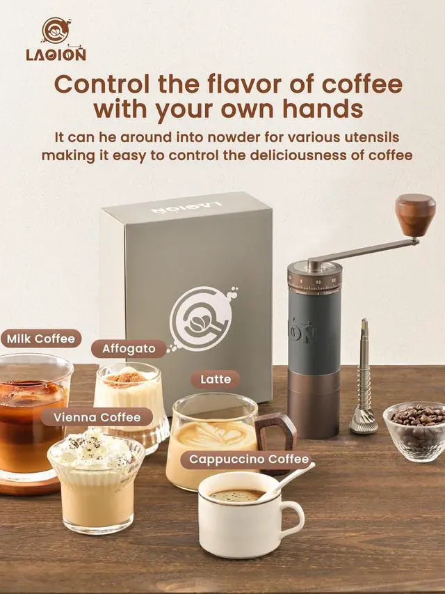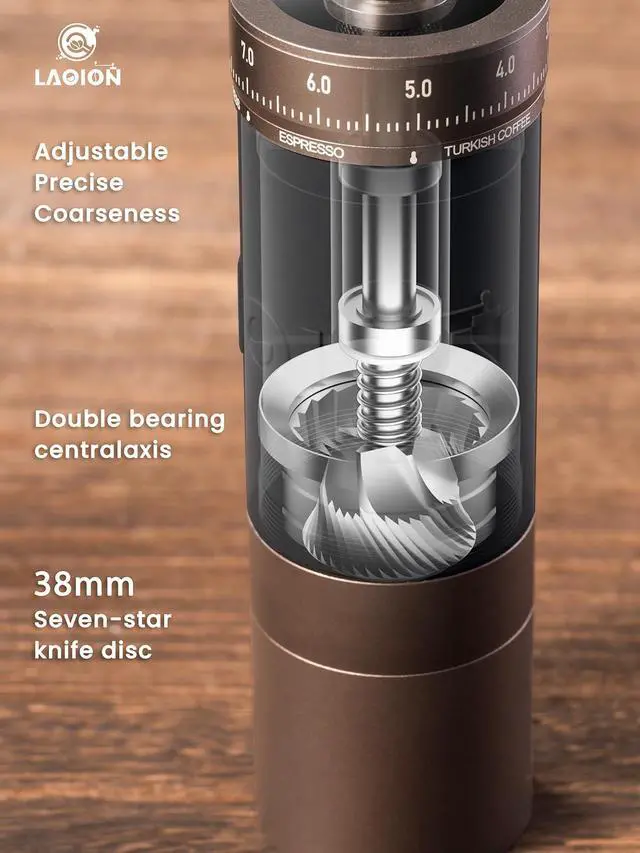 L6 Manual Coffee Grinder: Precision in Every Turn. Engineered for the true coffee enthusiast, the L6 combines smart design and serious performance. Its generous 35g transparent bean hopper lets you watch the grind, while the single-piece lid and handlecrafted with a walnut grip and aluminum armstay secure with no loose parts. Dial in your perfect grind in seconds with the external adjustment ring: 100 precise clicks in one full rotation, each click shifting just 16 microns for total control from espresso to French Press. Built around a durable 38mm stainless steel heptagonal conical burr set in a solid aluminum body, the L6 delivers remarkable consistency and flavor clarity. Complete with a cleaning brush and designed for daily reliability, the L6 is your hands-on partner for specialty coffee at home or on the gono fuss, just great coffee.