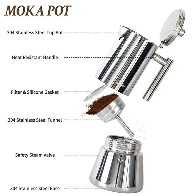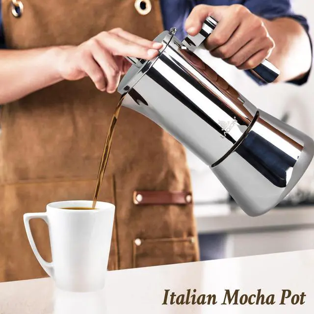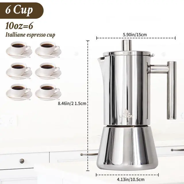 Brew Perfection, Every TimeExperience the rich, aromatic flavor of authentic Italian espresso. Our Moka pot is designed to brew up to 6 cupssmall espresso cups not standard mugsof delicious coffee in minutes(Mocha pot capacity: 10 fl.oz/300ml). Simply fill the base with water, add your favorite ground coffee to the filter basket, and heat on your stovetop.