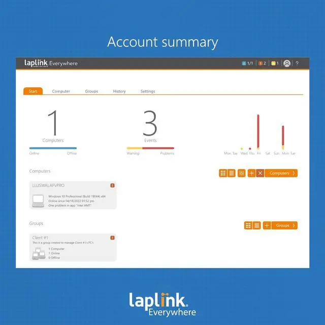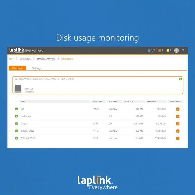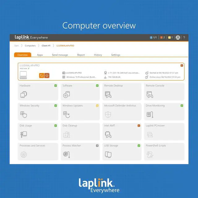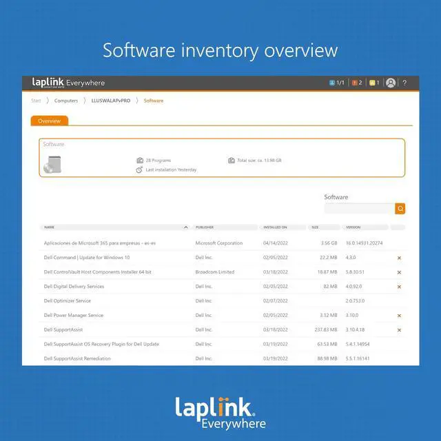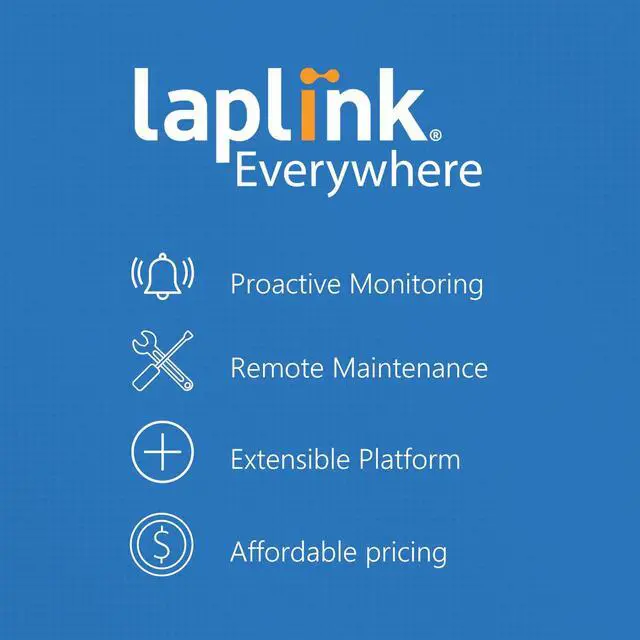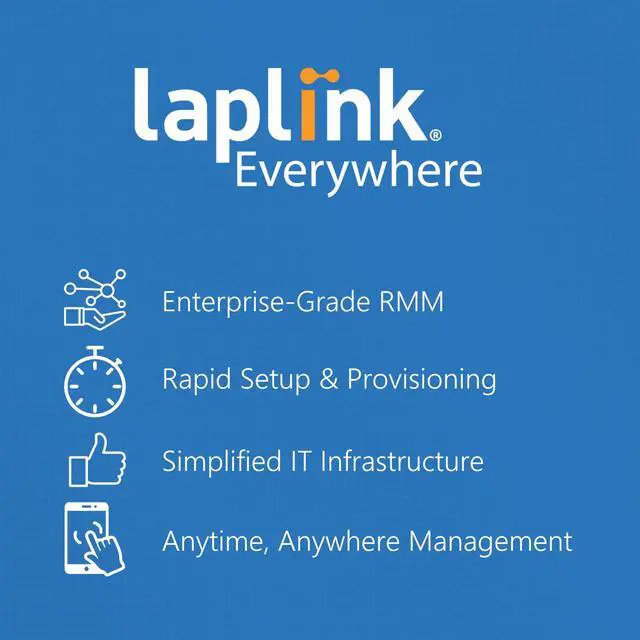 | Feature | Laplink Everywhere is a cloud-based PC lifecycle management solution that simplifies remote management of Windows devices for organizations with dispersed workforces. It provides enterprise-grade RMM without the need for additional IT infrastructure and services, making it easy to manage the entire lifecycle of your PC fleet. ENTERPRISE-GRADE RMM - Modern cloud-based PC lifecycle management allows IT to monitor, manage, and provision devices quickly and easily from anywhere. PROACTIVE MONITORING - Real-time alerts help prevent hardware performance issues, running unwanted tasks, and possible security breaches. RAPID SETUP & PROVISIONING - Setup takes less than 5 minutes: register, install, and you're ready to go! REMOTE MAINTENANCE - Ensure the health and security of PC’s, including antivirus management, software and hardware inventory, remote control, identifying and fixing performance bottlenecks, and more. SIMPLIFIED IT INFRASTRUCTURE - Effortlessly manage devices without the expense of additional servers, software, or IT services. EXTENSIBLE PLATFORM - Manage and deploy add-on modules like PCmover, SafeErase, and other software. ANYTIME, ANYWHERE MANAGEMENT - PC fleet management from any internet-connected device — a desktop, laptop, or notebook...even a tablet or smartphone! AFFORDABLE PRICING - Licensing at prices built for every organization's budget. |