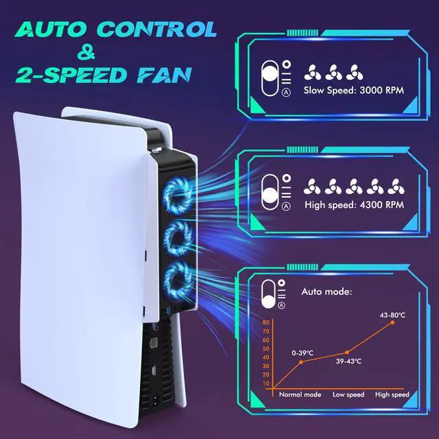 Ultra-Quiet Dual-Speed Operation Featuring upgraded motors and noise-reduction blades, the PS5 cooling fan system runs whisper-quiet under 25 dB even at high speed. Choose between Auto and Manual modes for the perfect balance of performance and silence.