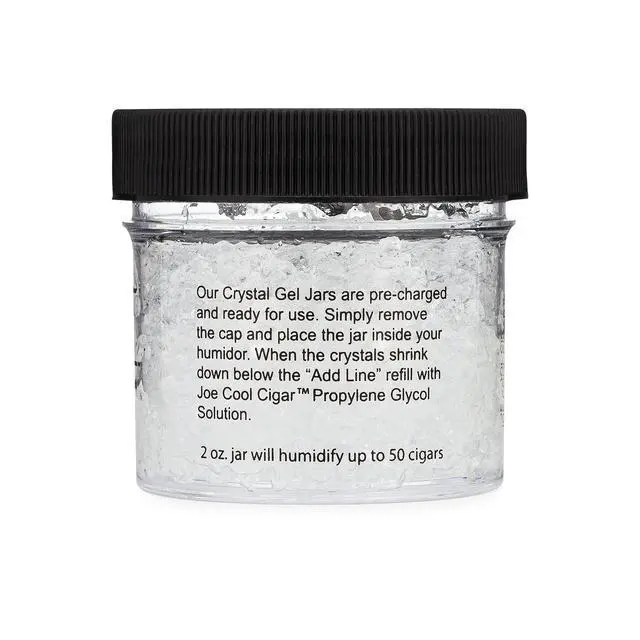 Joe Cool Cigar Crystal Gel Humidifier Jars are pre-charged and ready for use. Simply remove the cap and place the jar inside your humidor. When the crystals shrink down below the "Add Line" refill with Joe Cool Cigar Propylene Glycol Solution.