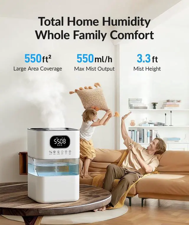 Generous 8.5L Capacity: On a single filling, the humidifier can run continuously for up to 65 hours, significantly reducing the need for daily refills. Its 3.3ft mist height allows for even dispersion, effectively covering areas up to 550ft² to maintain balanced humidity throughout the space.