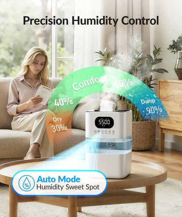 Precise Humidity Control: With a sensitive sensor (±5% accuracy) and 40-90% adjustable range, it automatically maintains your ideal humidity. Avoids over-drying or excess moisture for optimal comfort and plant/furniture care.