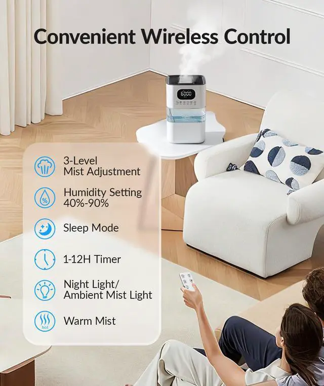 Adjustable Mist & Wireless Control: This humidifier offers 3 precise mist levels, including a maximum output of 550mL/h for rapid humidification. All functions can be conveniently operated from across the room.