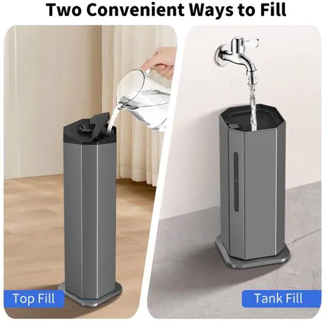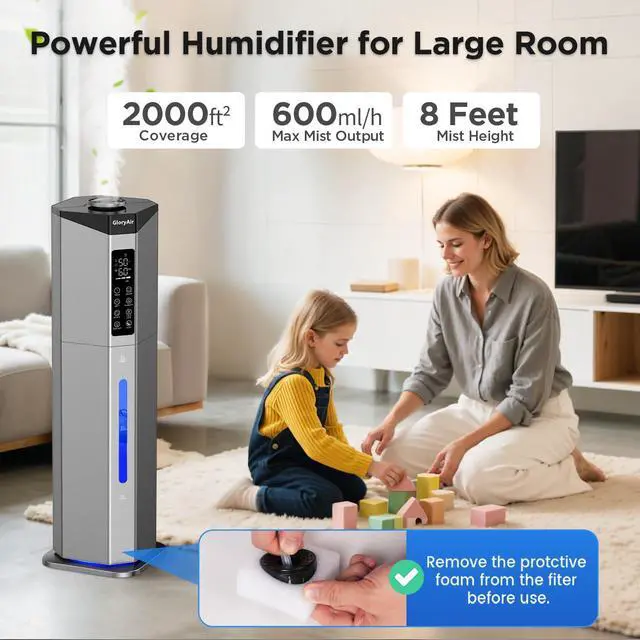 Experience optimal humidity control in expansive spaces with the GloryAir 2.38Gal/9L Dual Atomizer Top-Fill Humidifier. Designed for rooms up to 2000 sq ft, this high-capacity humidifier features dual 316 stainless steel atomizers, delivering a maximum mist output of 600mL/h and coverage up to 8 feet. The intuitive humidistat allows you to set your desired humidity (45%95%), while auto rotation (90°180°), an 18-inch extension tube, and a 360° rotating nozzle ensure even, comprehensive dispersal.